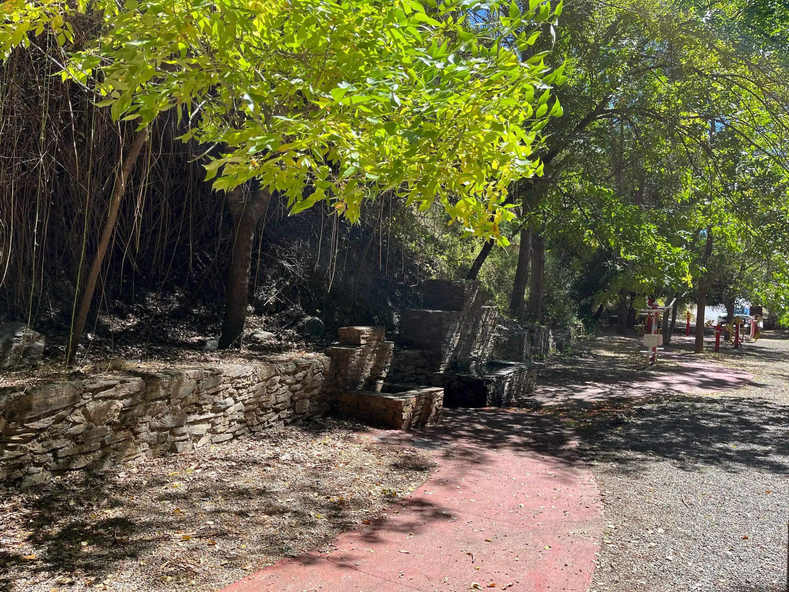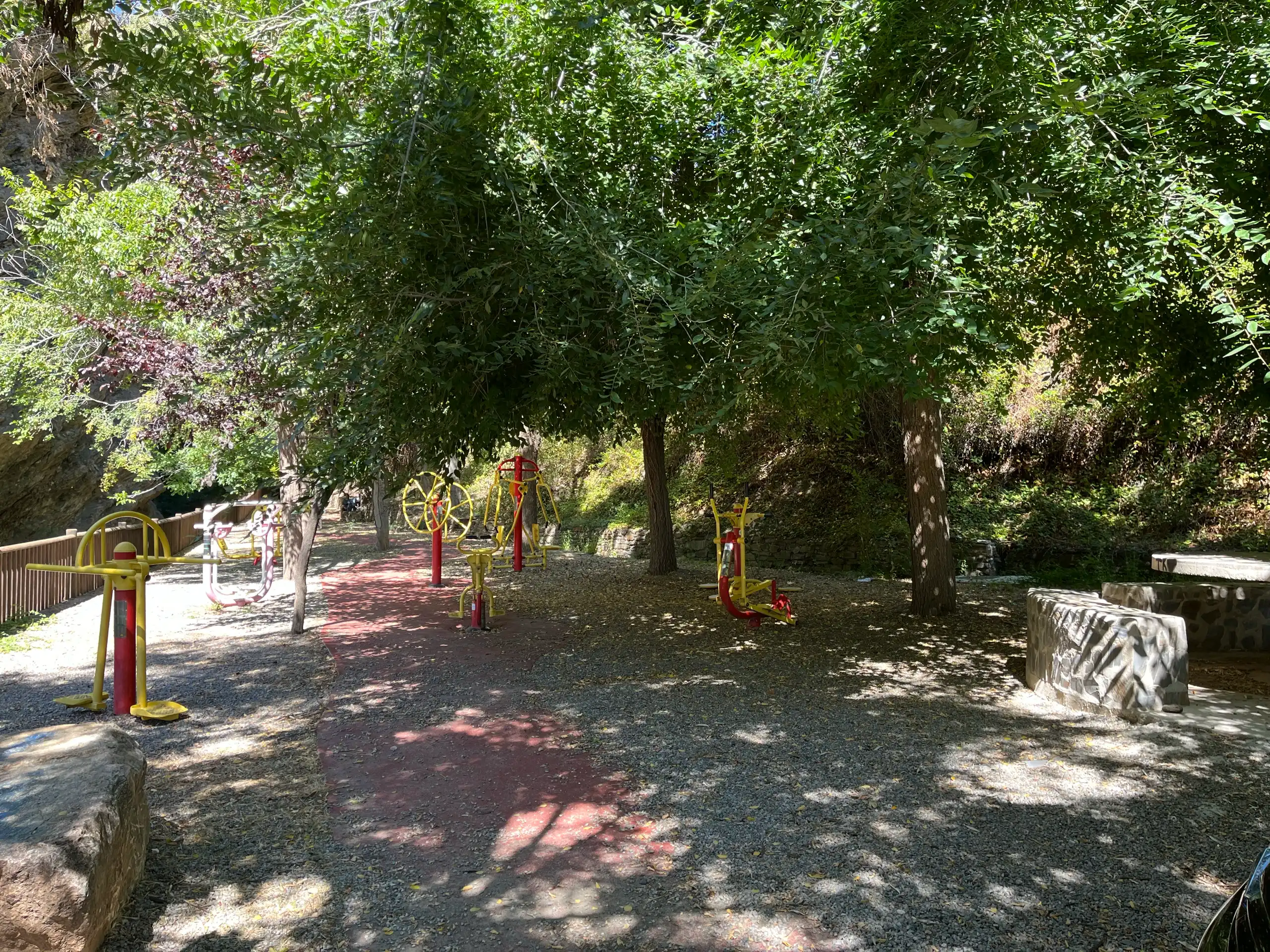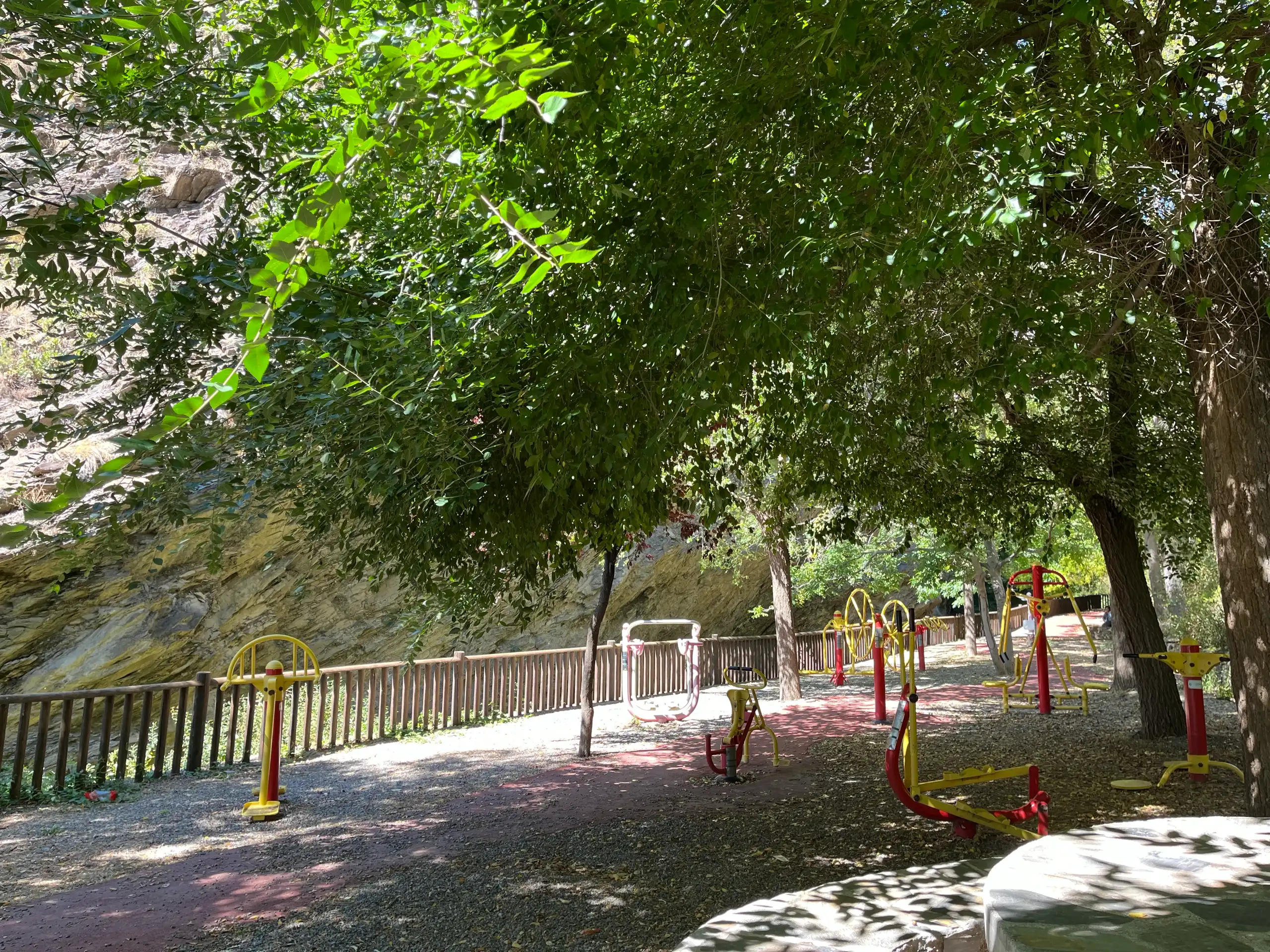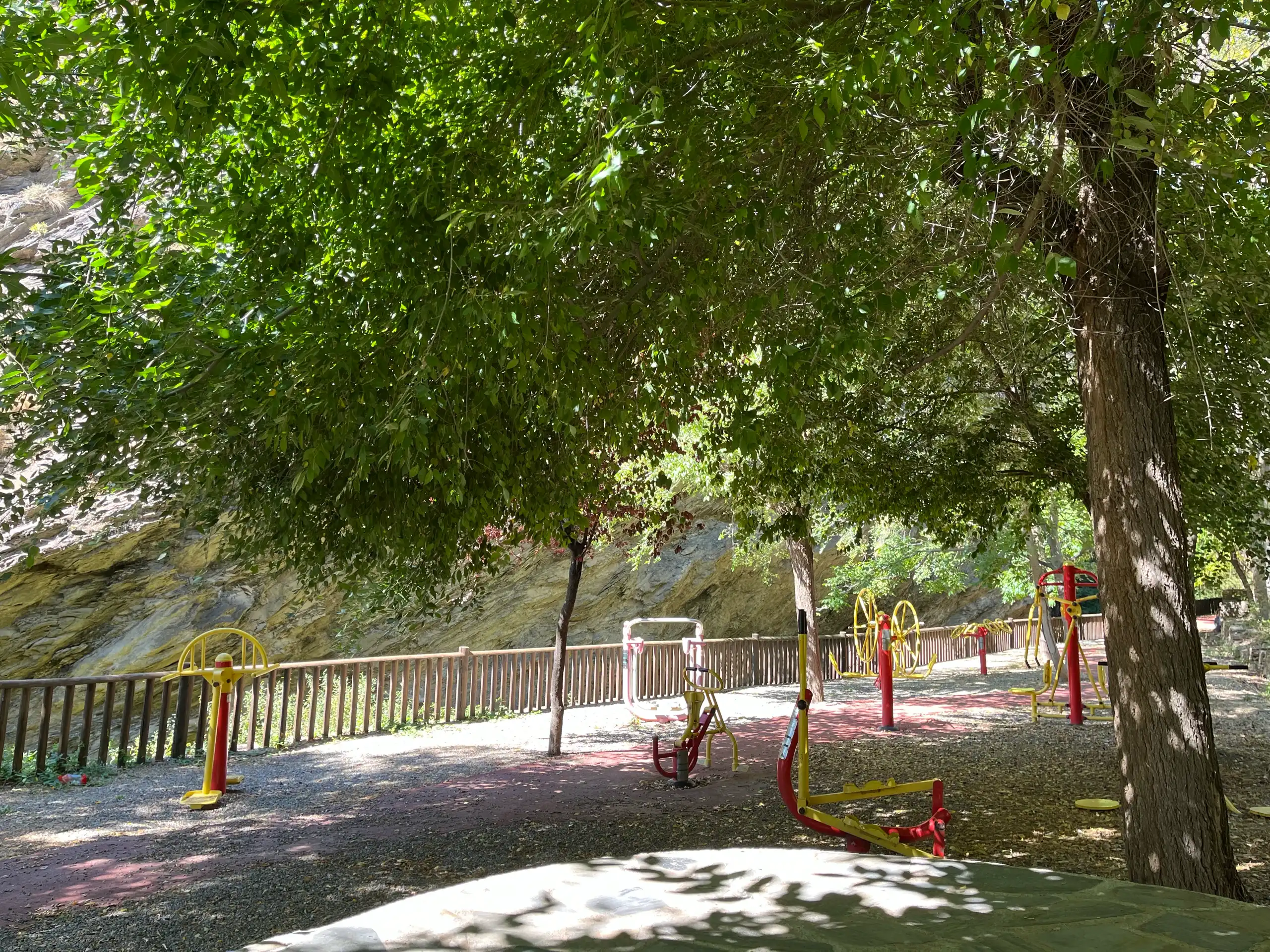 Cuenta con diversos elementos para realizar ejercicio al aire libre, como barras, espalderas y otros aparatos.